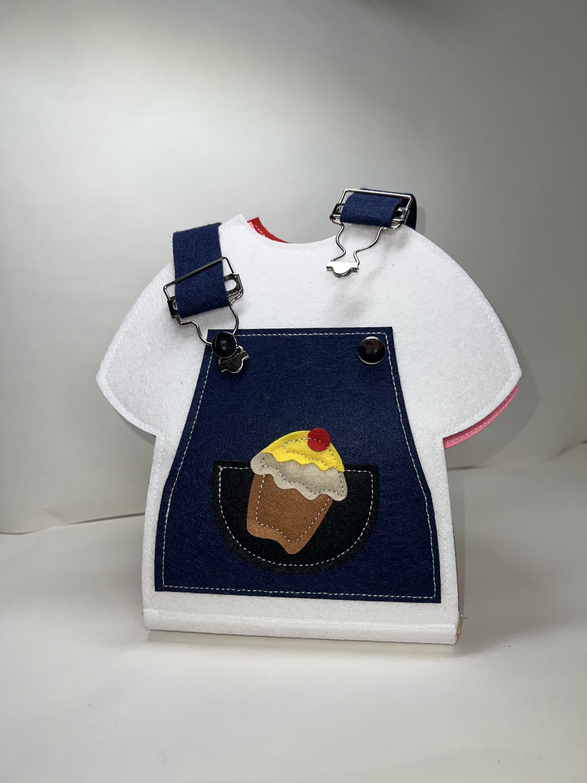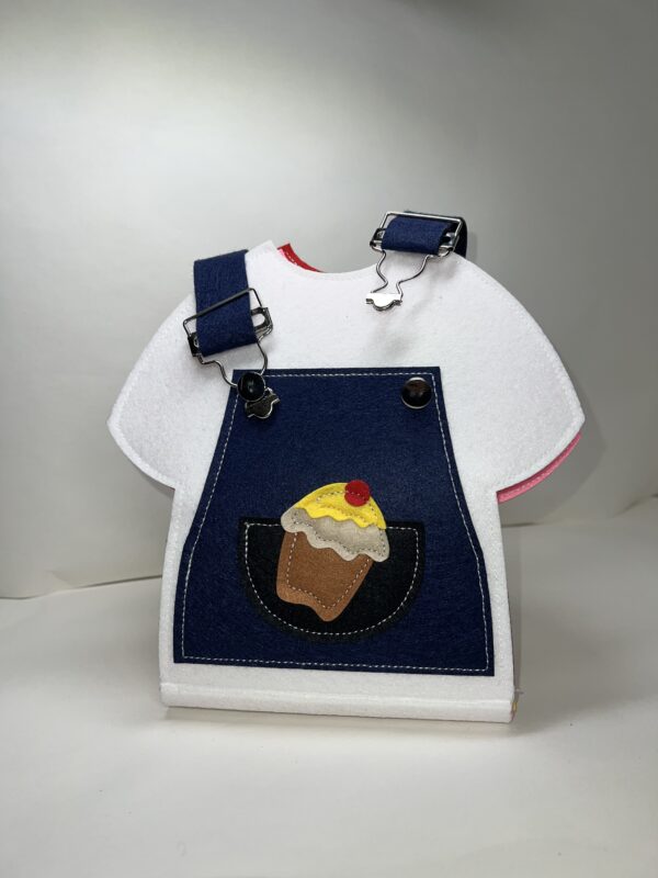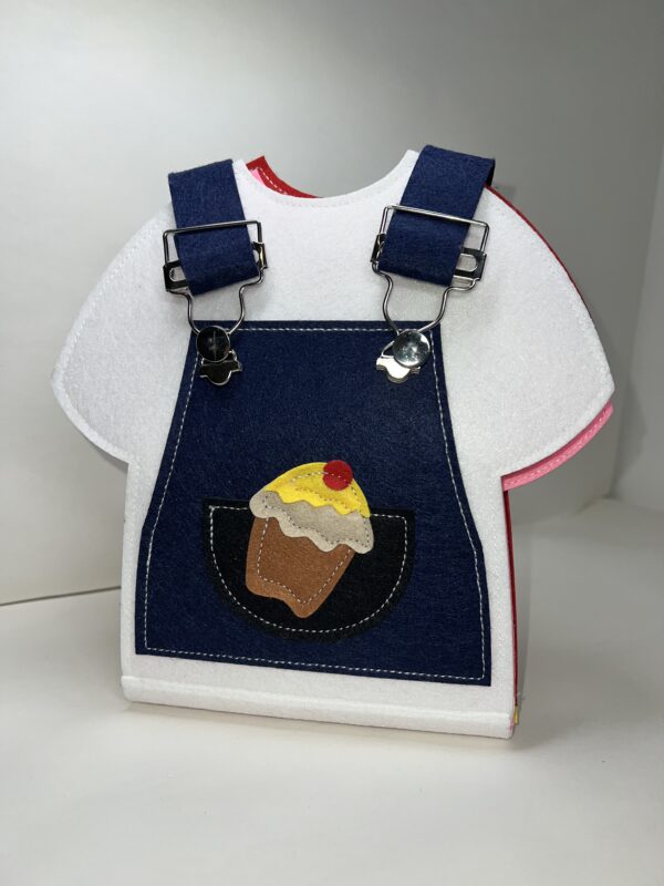 Zástera s prackami: Na prvej stránke dieťa otvára a zatvára dve kovové pracky na zástere. Tým si precvičuje presnosť, silu prstov a porozumenie zapínacím mechanizmom. Zástera predstavuje prvú vrstvu obliekania a podporuje dieťa v samostatnosti.