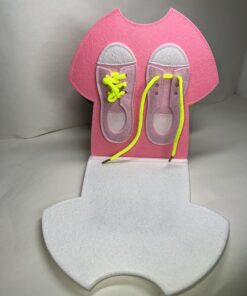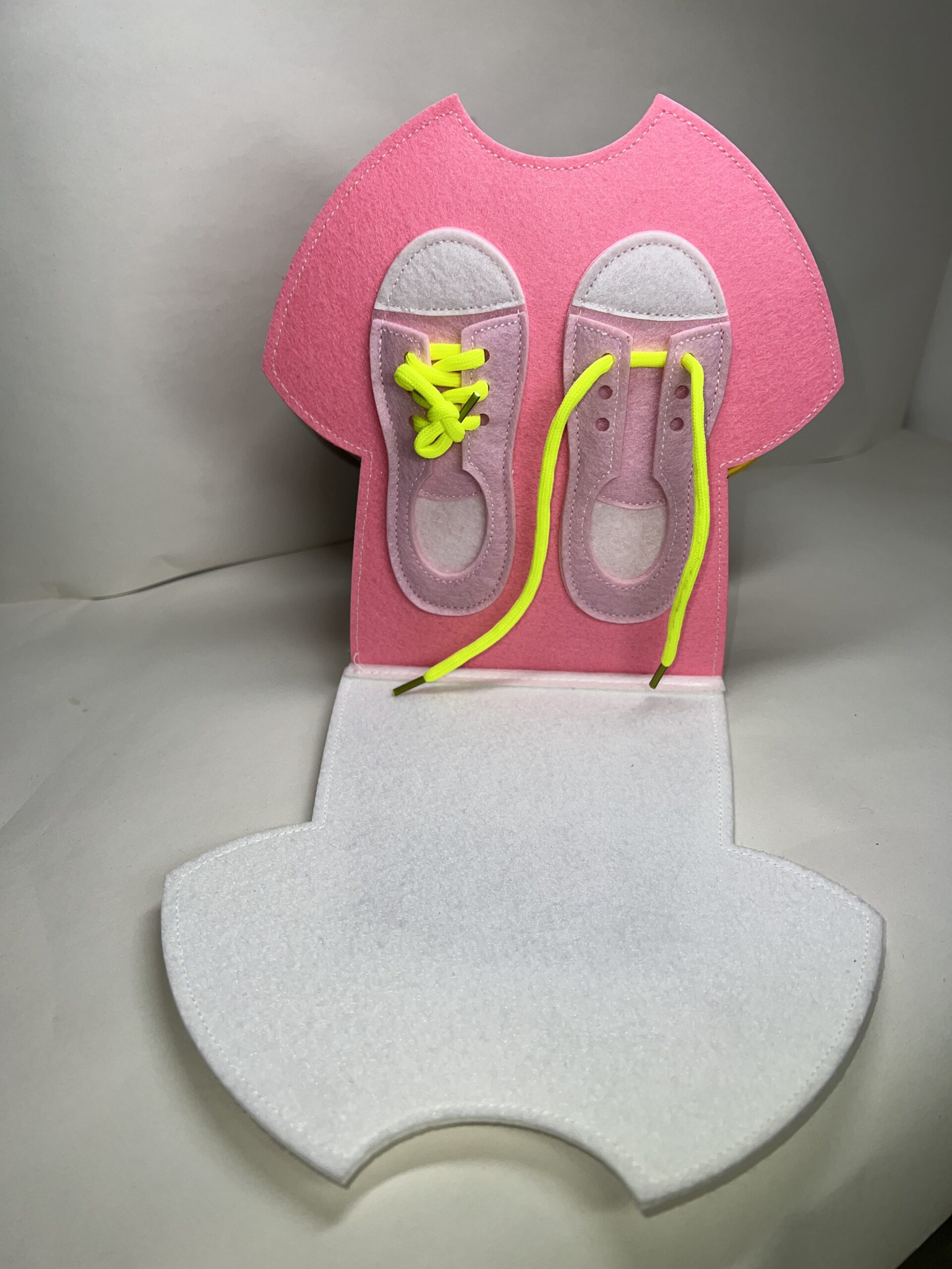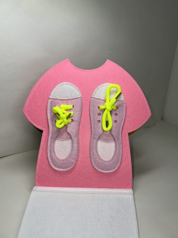Topánky so šnúrkami: Na druhej stránke sú dve topánky so šnúrkami, na ktorých dieťa trénuje viazanie, prevliekanie a uťahovanie. Táto aktivita posilňuje koordináciu oboch rúk, jemnú motoriku a logické chápanie postupnosti jednotlivých krokov.