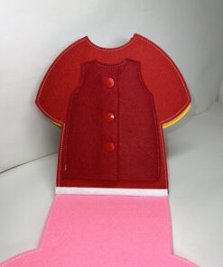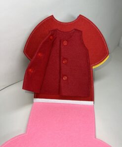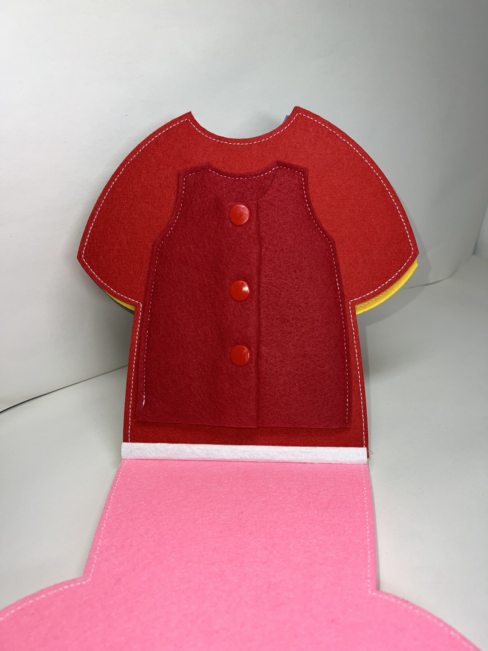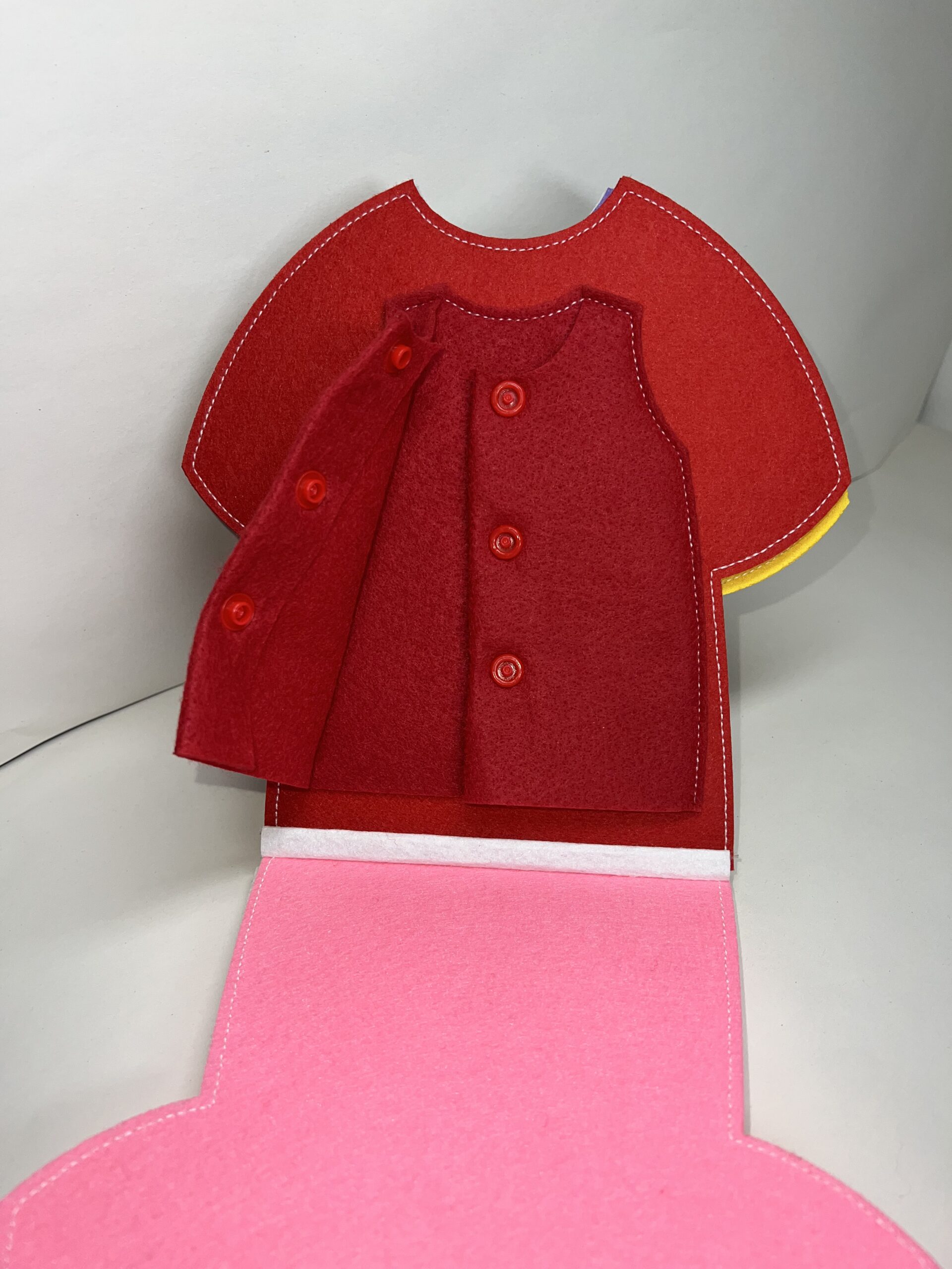 Červený kabátik s patentkami: Tretia stránka obsahuje červený kabátik s niekoľkými patentkami, ktoré dieťa zapína a odopína. Pri tejto činnosti si posilňuje prsty, rozvíja samostatnosť a učí sa, ako patentky fungujú.