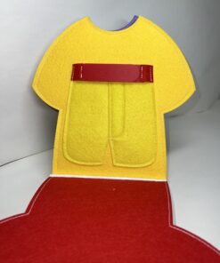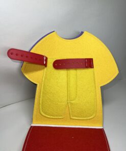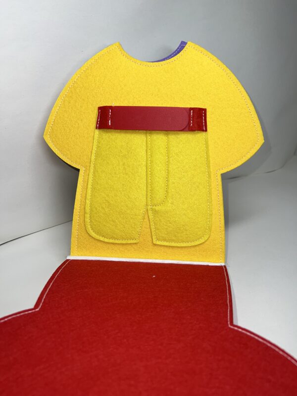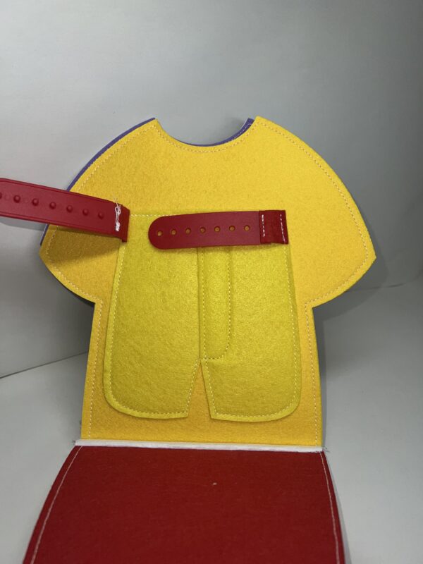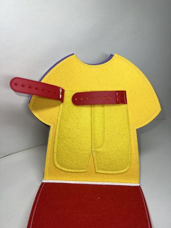 Žltá súprava s opaskom: Na štvrtej stránke dieťa zapína a odopína opasok pomocou suchého zipsu. Zoznamuje sa s jednoduchým zapínaním, učí sa vrstveniu oblečenia a rozlišovaniu jednotlivých častí outfitu.