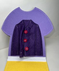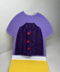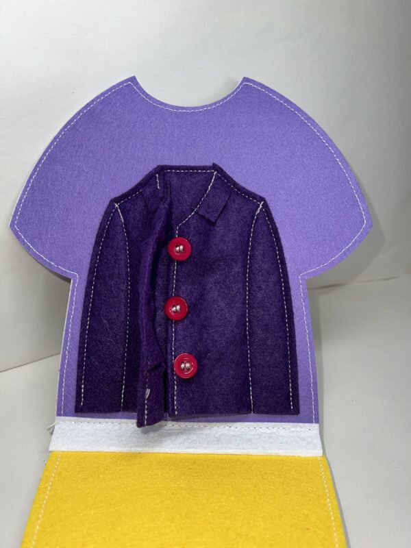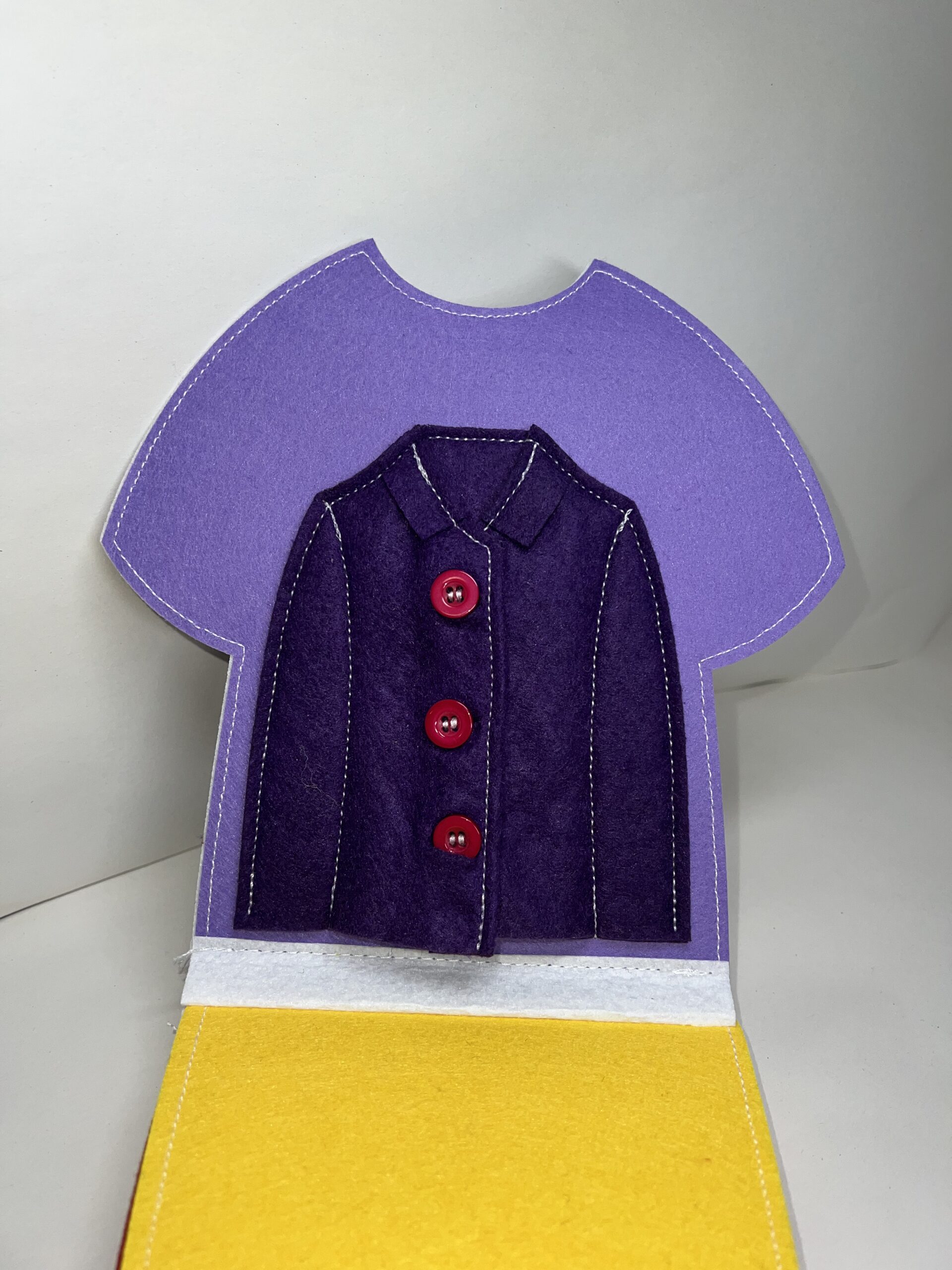 Fialová bunda s gombíkmi: Piatou stránku tvorí fialová bunda so skutočnými gombíkmi. Dieťa ich zapína a rozopína — čo je jedna z najnáročnejších zručností pre malé rúčky. Aktivita výrazne rozvíja jemnú motoriku, sústredenie a samostatnosť pri obliekan